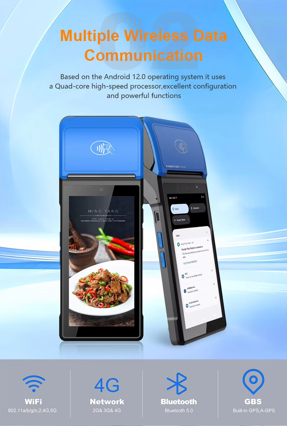 Connectivity is a critical factor for any mobile POS device, and the Kingtop KT-V510 excels in this area by supporting multiple communication protocols. It offers 4G, 3G, and 2G cellular networks, ensuring reliable internet access even in areas with varying network coverage. Additionally, the device supports Wi-Fi and Bluetooth, providing flexible options for connecting to other devices or networks.