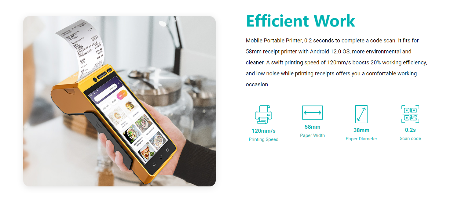 With an impressive printing speed of 120mm/s, the KT-S600 enhances working efficiency by 20% compared to traditional printers. Furthermore, the KT-S600 operates quietly, ensuring a comfortable working environment for businesses. By combining all these features, the KT-S600 provides a comprehensive and efficient solution for businesses' payment and printing needs.