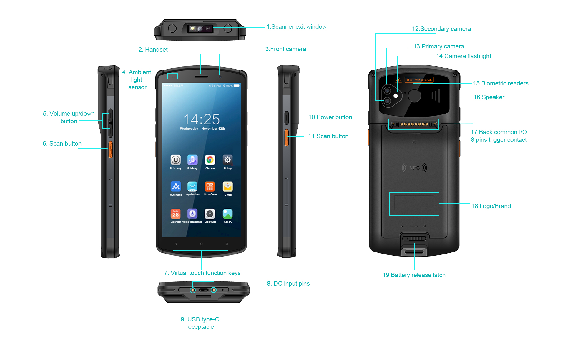 - Embedded market-leading scan engine Newland CM60, including dedicated GPS + 4G LTE cellular data, WiFi+BT, 1D/2D Barcode Reader and NFC/RFID.