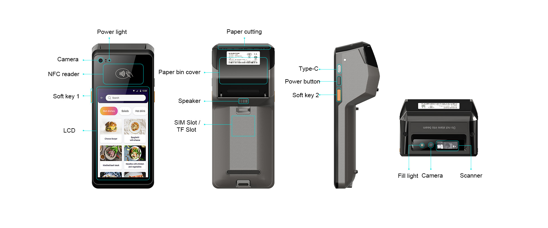 - Supports 4G, 3G, 2G, Wi-Fi, Bluetooth, and GPS positioning, POS printer support blue-tooth printing mode and ESC/POS mode. Improve your efficiency.